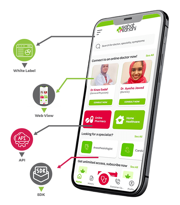 Take control of your consumer’s healthcare needs by benefitting from advanced-level integrated e-health solutions. To ease healthcare accessibility, utilize APIs, white-label modules, no-code web view integration, and SDK developed by Sehat Kahani which can be integrated into any software solution.
